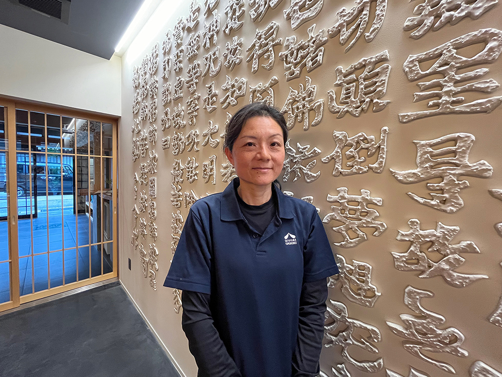 家具や小物はそのほとんどが飛騨の職人によるオーダーメイドで、古い水屋を改装して再利用するなど古材や古民具を活かしたアイテムも。また多目的スペースとして使われる1階のキッチンスタジオでは、飛騨家具職人の技だけでなく地元陶芸作家の素晴らしい技にも触れられる。壁一面に貼られているのは手びねりによる般若心経の陶文字アート。そのアーティスティックな場所は宿泊客の朝食会場となるほか料理教室などのイベントを行っており、ゲストは飛騨の郷土料理体験を楽しんだりできるそう。このように宿まるごとが飛騨の文化や伝統工芸を体験できる空間となっている。
