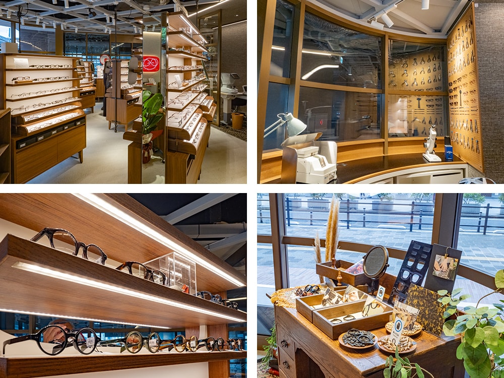 店長の上田 徹也(うえだ てつや)さんは「当店の特徴は、商品棚が従来の眼鏡店に多い配置と異なり、ジグザグになるよう商品棚が置かれていること。さらに商品棚の高さが互い違いになるようになっており、森をイメージした配置にしています。こうすることでお客様が店内を回遊し、楽しめるようにしました。また当社初となる『メガネマスターズアトリエ』ブースを設置。プロの手による眼鏡のメンテナンスを実施しています。またプロの仕事道具や昔の機材などを展示し、新しさの中に『専門性』や『匠』を感じさせるようにしました」と話す。