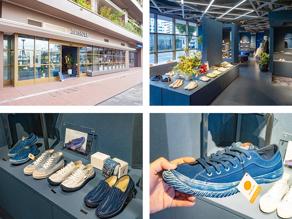 オープン時には店舗限定商品として、地元の藍染企業が染色したスニーカーも販売された。藍色に染められたのは、広島市の平和記念公園などに捧げられた折り鶴を再生した糸で靴の生地をつくった、生成色の「折り鶴再生スニーカー」だ。ほかにも備後にゆかりのある製品が並べられている。取材時には、備後絣の織元で織られた生地を使用したSPINGLE公式オンラインショップ限定モデルを特別に店頭販売していた。