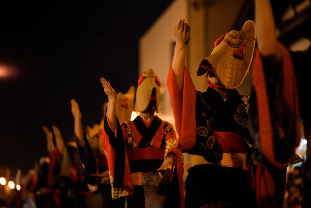 この踊りには、400年以上の歴史があり、二拍子の伴奏が、三味線、太鼓、鉦鼓、篠笛などによって演奏され、「連」と呼ばれる踊り手たちが町内を踊り歩く。