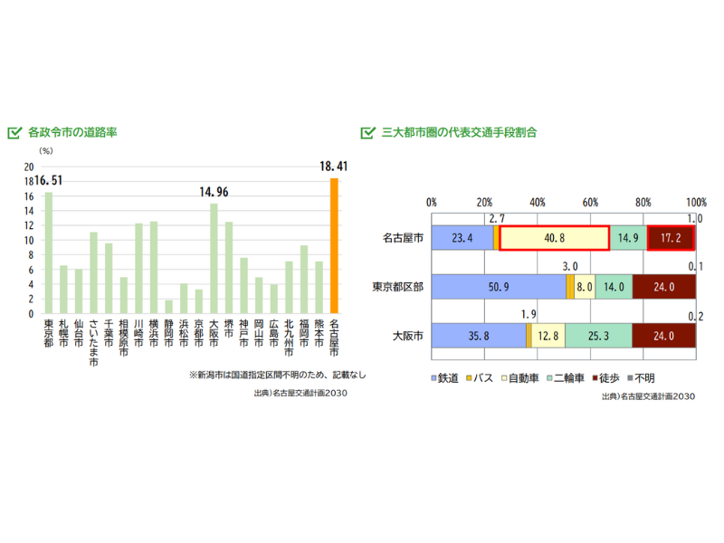 しかし、名古屋市は全国でも有数の「車社会」のまちだ。全国の政令都市の中でも、道路率(※)は18.41%で、東京都の16.51%を抜き1位。人々の交通手段も車が約40.8%を占め、大阪市12.8%、東京都区部8.0%を大きく引き離している。(出典:名古屋交通計画2030)