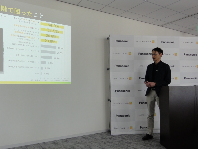 パナソニック ハウジングソリューションズ株式会社が開催したリノベーションセミナーの中で、水廻りシステム事業部マーケティング統括の窪井健司さんは「住宅金融支援機構の調査でも、中古住宅(戸建・マンション)購入時のフラット35利用は伸びています。マンションストック数が増加する中、中古住宅を利用する方、リノベーションを検討する方への提案を改めて考えていく必要があると思っています」と話す。