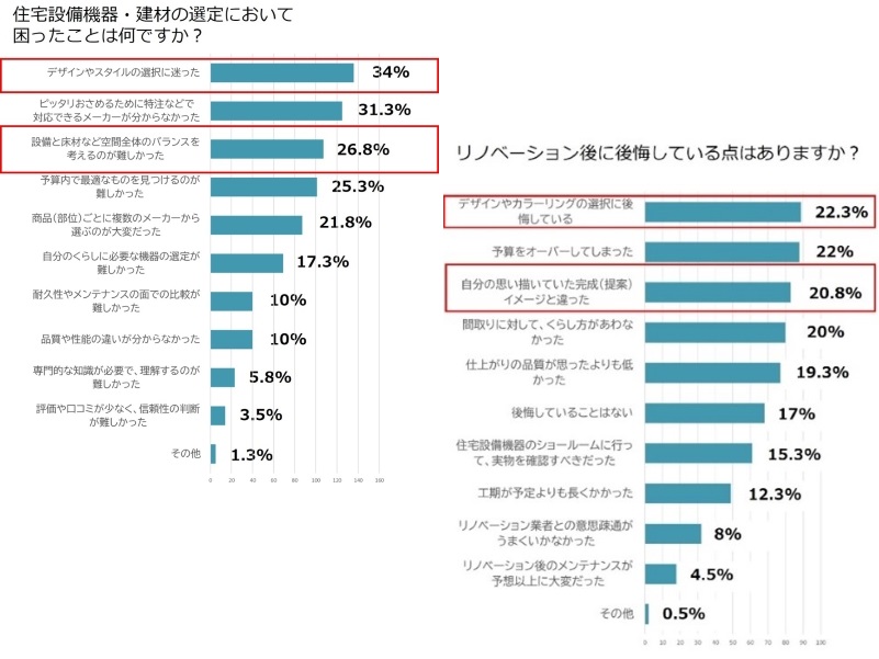 調査からも、「希望するデザインやスタイルを見つけるのが難しかった(34%)」「予算とのバランスが難しかった(32.5%)」「リフォーム業者やデザイナーとの意思疎通がうまくいかなかった(26.8%)」という方が多く、「自分が完成後にどう暮らしたいのか、見つけるのが難しかった」「自分の希望を伝える情報・画像を集めるのが大変だった」などといった声が聞かれ、自分のイメージを明確にすること、伝えることの難しさが見えてくる。