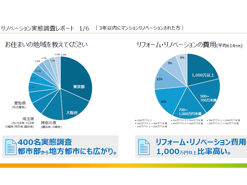 今回の調査対象の居住地は、東京都が31.8%、大阪府は17.0%、神奈川県(横浜市・川崎市)が11.5%と都市部に居住する方が多いため、若干高額になっている可能性もあるかもしれないが、1,000万円以上が多いことに関して窪井さんは「自分らしい住まいを作るためには、ある程度、予算をかけてでもリノベーションを実施したいという人が多くなっていると思います。また、最近では、マンションリノベーションは、都市部だけでなく、地方でも住まいづくりのひとつの選択肢になってきていると感じています」と話す。