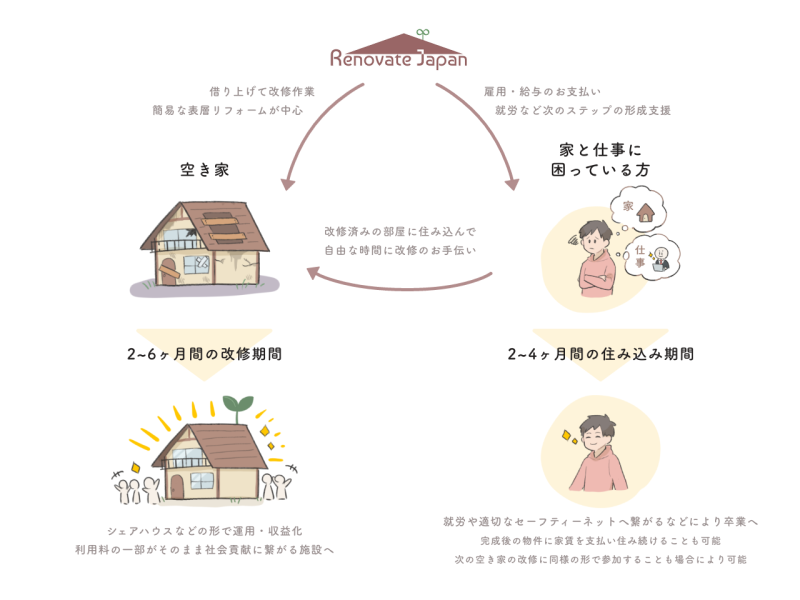 人×家×社会の「タテナオシ」を目指すRenovate Japan。リノベーターの生活の立て直しと空き家の建て直し、それによる社会の立て直しを実現する事業となっている。