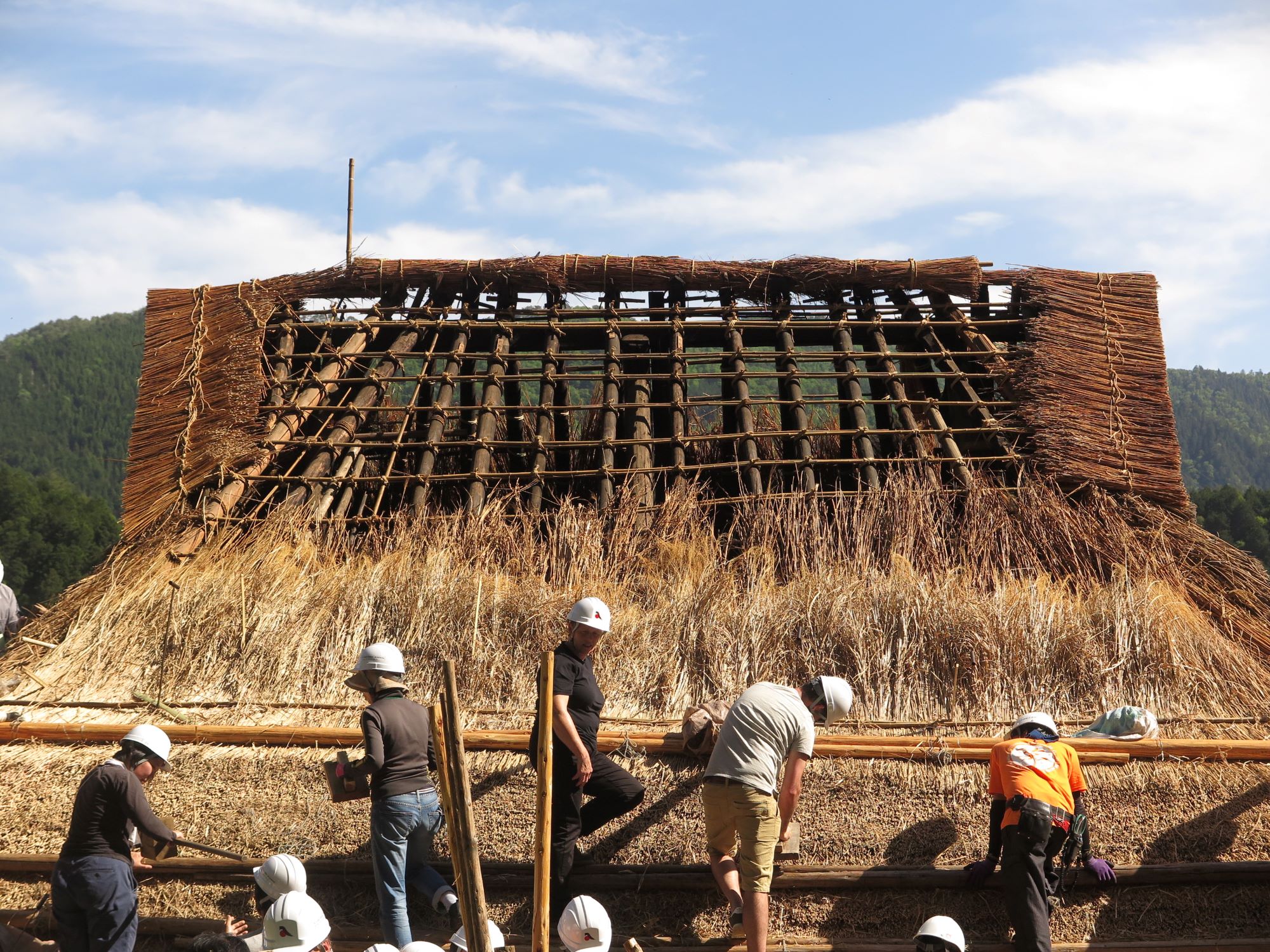 「自分もあの屋根にのぼってみたい」。そう思った立松さんは、大学院生のときに京都府南丹市美山町で行われた茅葺きワークショップに参加。2泊3日で茅葺き職人の指導のもと、参加者たちと一緒に作業した。