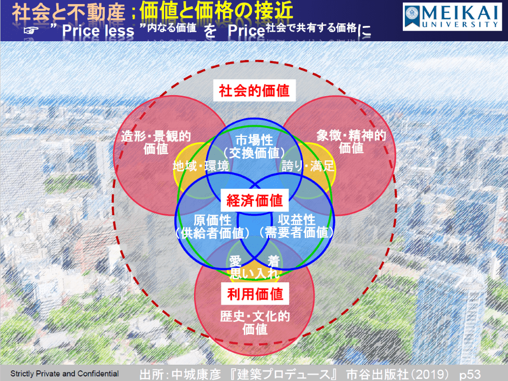 中城さんは社会と不動産において、経済価値だけではなく「社会的な価値」まで考えることが重要だという。「内なる価値=プライスレス」を社会で共有する価値に変えていくことが大切だ。
