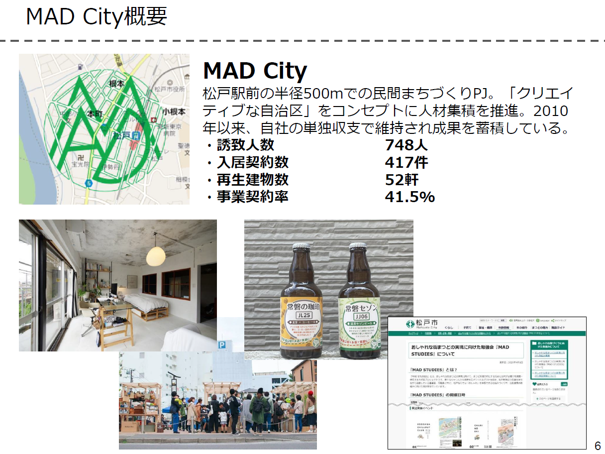 まちづクリエイティブは、2010年から千葉県松戸市で「MAD City」というまちづくりプロジェクトに取り組んできた。松戸駅の半径500メートルを仮想のまちと見立てて「クリエイティブな自治区」をコンセプトとしている。取り組みの結果、建物の再生は52軒、入居契約数は417件という成果を上げている。