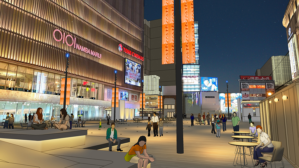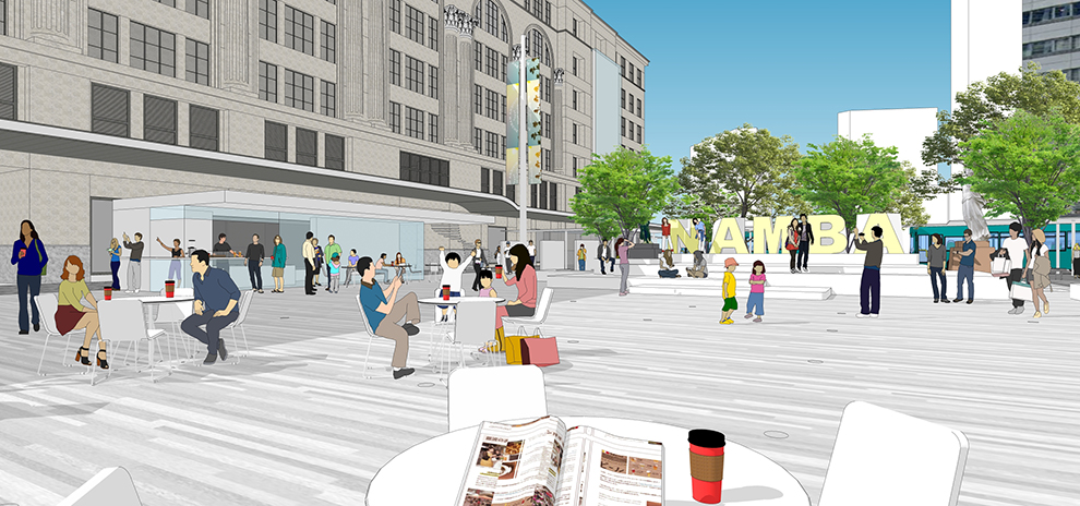 「今まで、交通の要所としてバスやタクシーのプール機能がありましたが、それが人の回遊の障壁になっていたのではないかと思っています。人中心の空間として、人が集い、歩いて楽しいエリアの中心として、ミナミの回遊のポイントにしたい。ここを拠点に人を送り出す、ポンプの役割を果たせたら、と考えています」