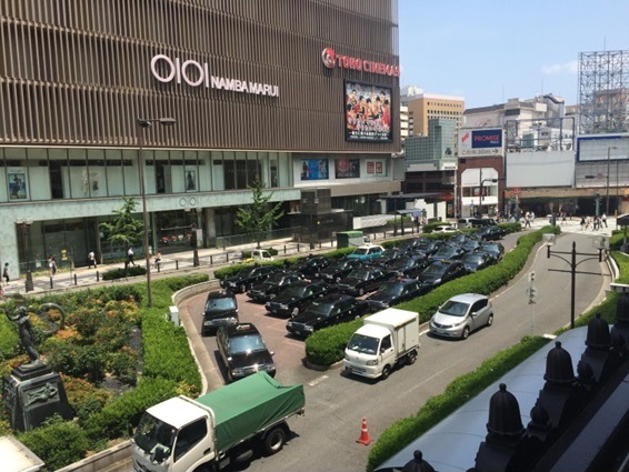大阪のメインストリート御堂筋。これを南へ行くと突き当たるのが、髙島屋大阪店と南海電車の「なんば駅」だ。なんばといえば、「キタ」「ミナミ」と称される大阪の2大繁華街のひとつであり、関西空港から来るインバウンド客でも大変なにぎわいを見せている。また、駅前にはタクシー乗り場やバス停留場があり、向かいの戎橋筋商店街と駅を行き交う多くの人や、御堂筋から分離していく自動車交通でごった返している。それがなんば駅前の日常だった。