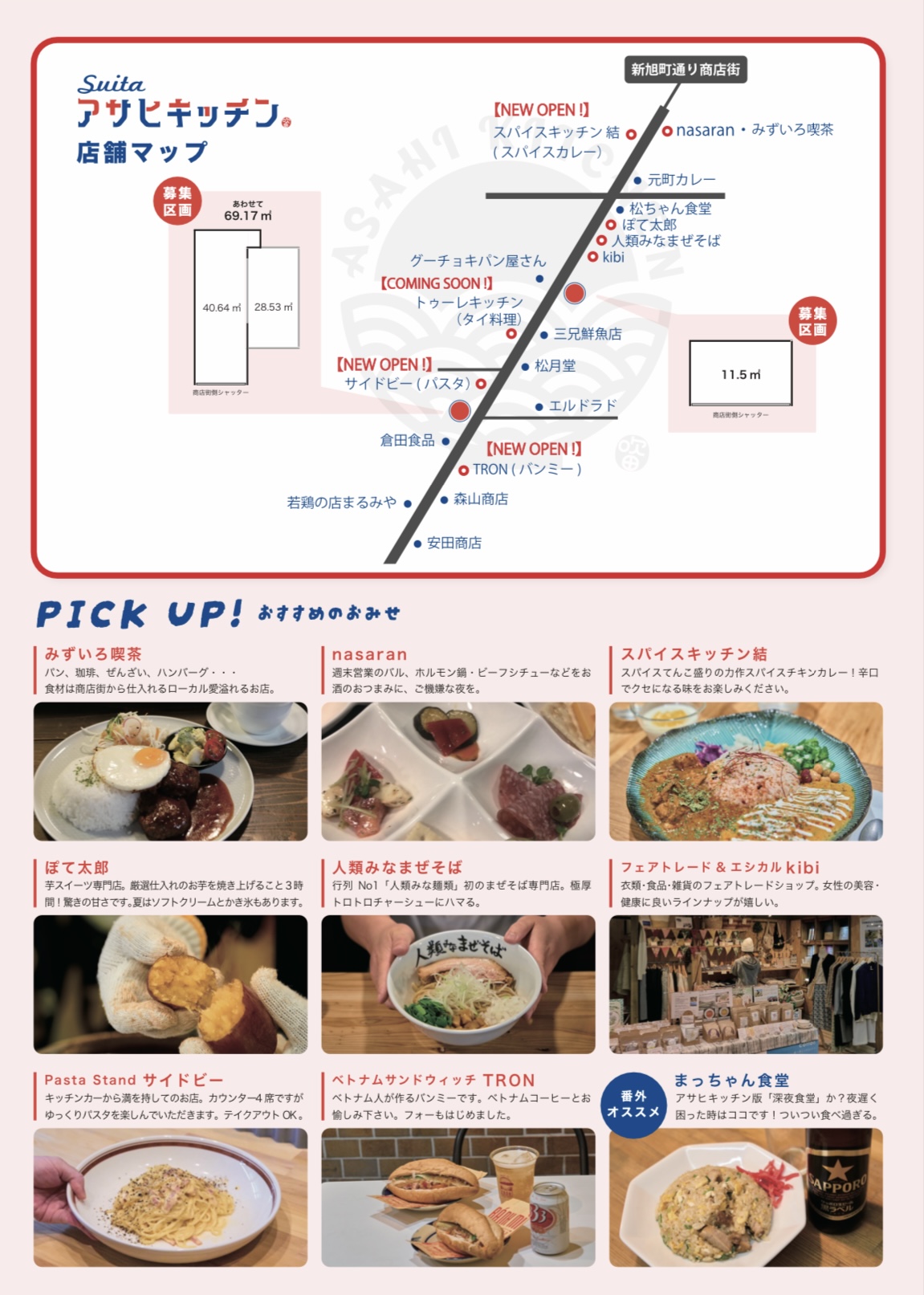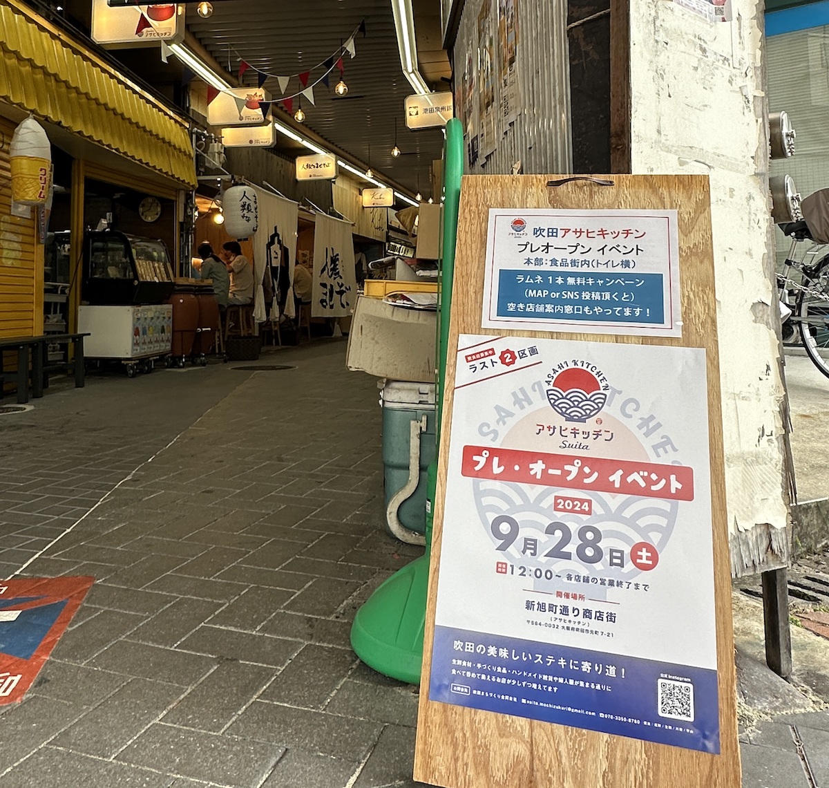 スキタ会は、2023年5月に吹田まちづくり合同会社へと法人化。商店街再生プロジェクト「吹田・アサヒキッチン」では、商店街内の6つの空き店舗から活用してほしいと申し出があった。空き店舗の借り上げを行い、飲食店出店に必要なインフラ(ガス・給排水・換気等)を整備するなど、自らが空き店舗所有者と出店希望者双方の支援者になった。商店会の加盟費を吹田まちづくり合同会社が負担するなど、初めて店をオープンする事業者にとってもハードルの低い条件を整えた。