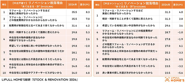 それ以外の中止理由では「どのくらい費用がかかるか分からなかった」「検討・判断することが多くて面倒に思えた」「中古物件の価格が妥当なのか分からなかった」などが多く挙げられている。
