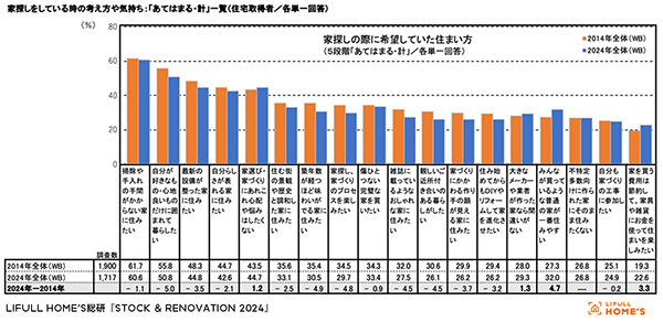 ある意味、住まいにこだわりがなくなっているともいえるわけだが、その一方で条件は厳しい。「通勤・通学の利便性」を重視する人が減った以外はほとんどの条件で重視する人の割合が増えた。