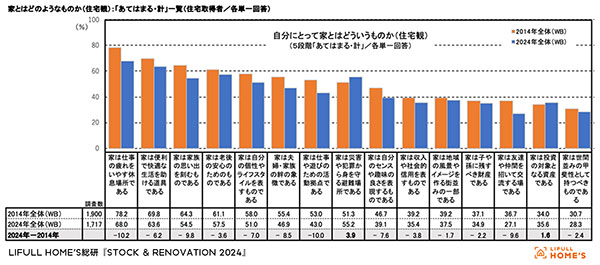「そのうちでも伸びたのが投資・貯蓄で5.3%の増。衣食住では衣への関心がマイナス8.8%になっています。自分にとって住宅とはどのようなものかという問いに対しても「家は仕事の疲れをいやす休息場所である」(マイナス10.2%)、「家は仕事や遊びのための活動拠点である」(マイナス10.0%)などとほとんどの項目で回答が減少。増えたのは「家は災害や犯罪から身を守る避難場所である」(プラス3.9%)、「家は投資の対象となる資産である」(1.6%)だけ。住宅に対する信念が希薄化し、激甚災害などを受けてか、命と金を守るものとしてリスク回避意識が強くなっていると思われます」