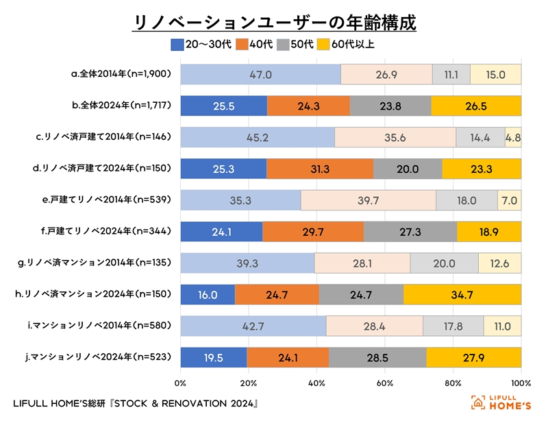 2024年の調査は2014年同様に47都道府県の県庁所在地(東京は23区)、政令指定都市に居住する学生を除いた20歳以上の男女で、5年以内の住宅取得者、3年以内に住宅取得を検討している人を対象とした。実際の市場では新築物件取得者が中古物件取得者よりも多いため、自然回収に任せるとターゲットとなるリノベーション実施者のサンプル数が少なくなってしまうため、それを是正するために回収数を多くする他の調整を行っている。