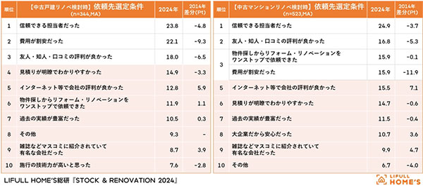 一方、中古を買ってリノベーションという選択をした人の変化では依頼先選定条件が挙げられる。2014年と比較して大手や有名な会社を選ぼうという意識が強まったのである。