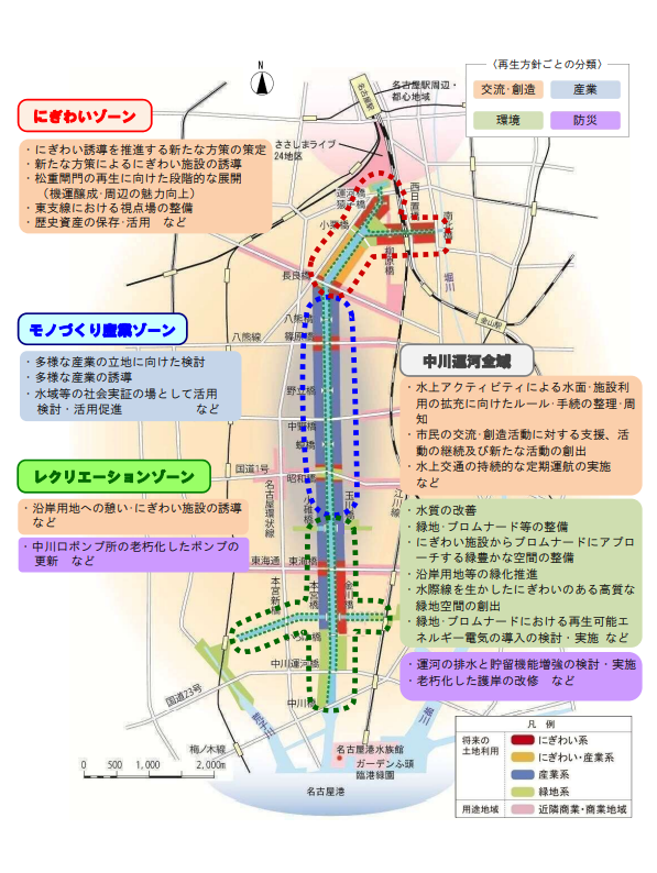 中川運河再生計画では、「にぎわいゾーン」「モノづくりゾーン」「レクリエーションゾーン」の3つのゾーンに分けた空間計画も打ち出した。