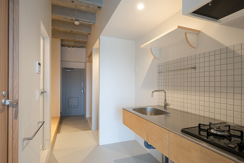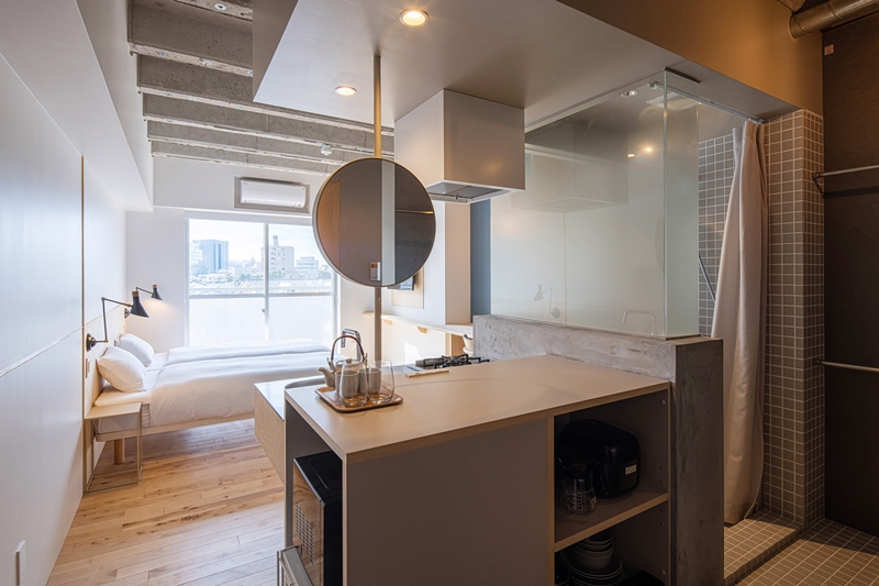 4階以上は住宅となっている。シンプルなモルタル仕上げの3階とは異なり、白のタイルや木を使った温かみのある空間で1ケ月単位で利用できる家具・家電付きのマンスリーマンションとして利用されている。ここも銭湯の入浴&サウナを無料で利用できる特別特典付き。出張、研修、単身赴任時その他で長期滞在をする時などの利用を想定しているが、そこに銭湯があるのはうれしい。しかも、周辺には他にあまり高い建物がないため、眺望も楽しめそうである。