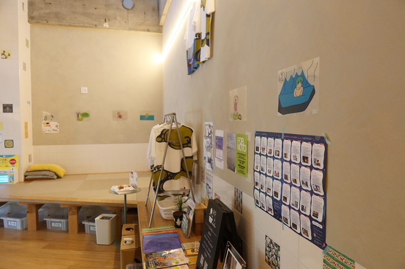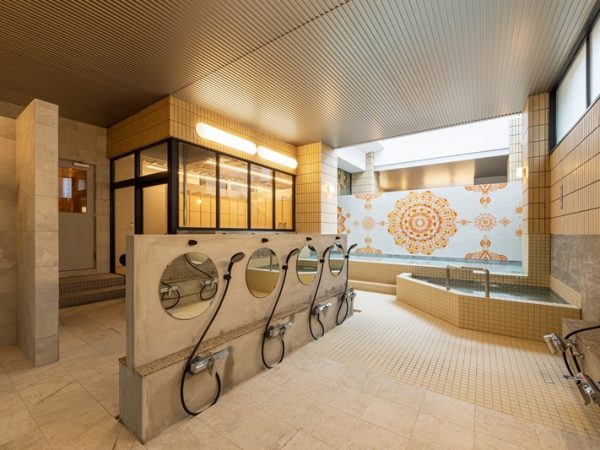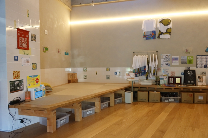 1階の銭湯部分は昔は番台方式だったものをカウンターにし、サウナを広げた。取材時はすでに営業が始まっていたため、銭湯内は見られなかったが、九谷焼のタイルを使ったモダンな銭湯絵はなんとも新鮮。コンクリート打ちっぱなしの店内、小上がりも印象的で、今時の銭湯ならでは。
