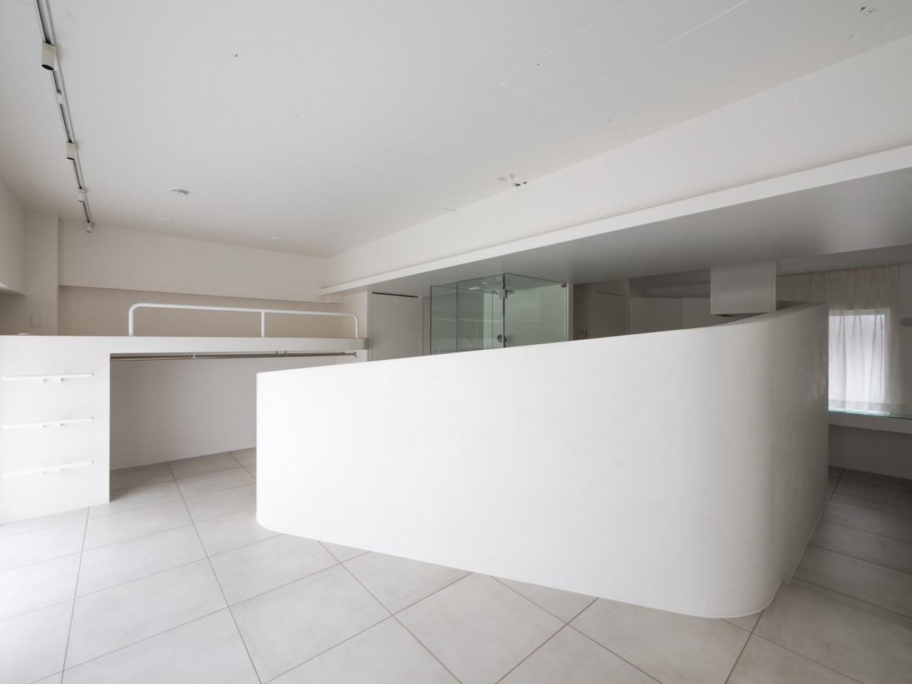 もうひとつ、シングル向けでミニマリズム・リノベーション賞を受賞した『時代を超えた賃貸 『2001年宇宙の旅』』(イー・ワークス株式会社)をご紹介しよう。これは築31年、47.45m2のごく普通の2DKを中央に白いRを描く壁のある1Kにしたもの。部屋の中央、存在感のある壁の向こうにはキッチン、洗面台、シャワーブースなどが配されている。