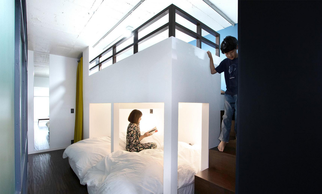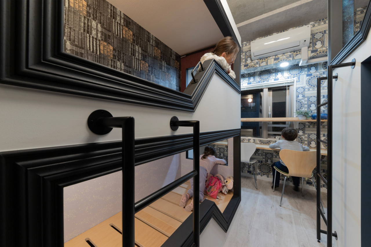 空間を縦に使うことで面積以上の広さを手に入れたのがわくわく空間創造リノベーション賞を受賞した『7帖に作る3つの秘密基地』(株式会社i-Plain)。元々は二段ベッドとタンスがいくつか置かれていた6畳の子ども部屋と隣接するクロゼットを解体して7畳とした上で、二段ベッド、ロフトベッドと勉強スペースを設置。ベッド内にはそれぞれが好きなクロスを貼り、プライベート空間としても使えるようになっている。ロフトベッド下には収納もあり、実用的でありながらわくわくするという普通には相いれない要素がうまくミックスされているのが特徴。子どものいる家庭には参考になりそうだ。