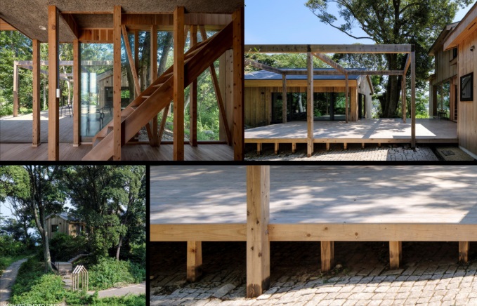 そこで土中環境の改善のために母屋と離れをつなぐウッドデッキの支柱はコンクリートや束石ではなく、糸島の間伐材を焼き杭にして利用、焼き杭を地表に突き立てることで雨水が杭から地中に還元されるようにした。建築的な課題の克服と同時に自然との共生、森林の再生を意図されており、過去のマイナスを現代の知見、技術でプラスに変えようというわけである。