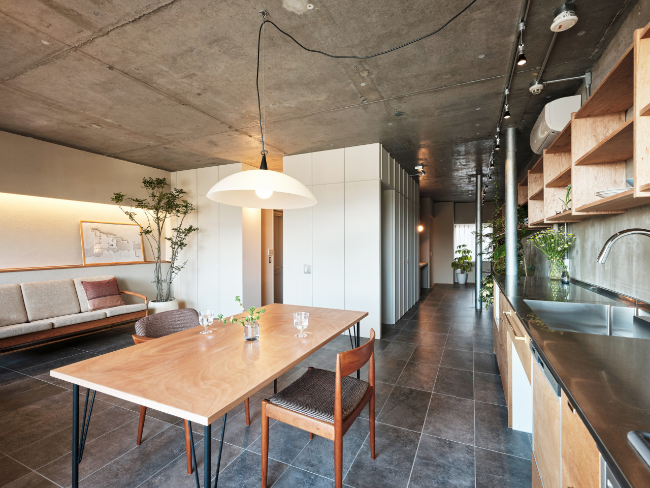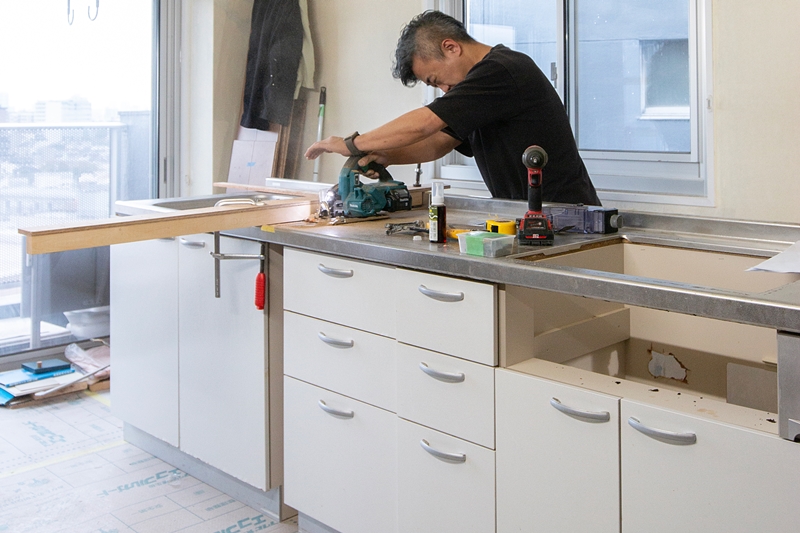サーキュラー・エコノミーのサーキュラーとは循環を意味する。建築の場面でいえば資源を可能な限り再利用することで廃棄物を最小化、環境への負荷をできるだけ抑えるというやり方と考えれば良いだろう。同物件ではI字型キッチンを切断してL字型にしたり、外した天井板を別の場所に使ったりと既存の内装をできるだけ捨てずに再利用、新たな空間に生まれ変わらせている。