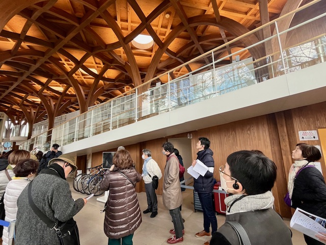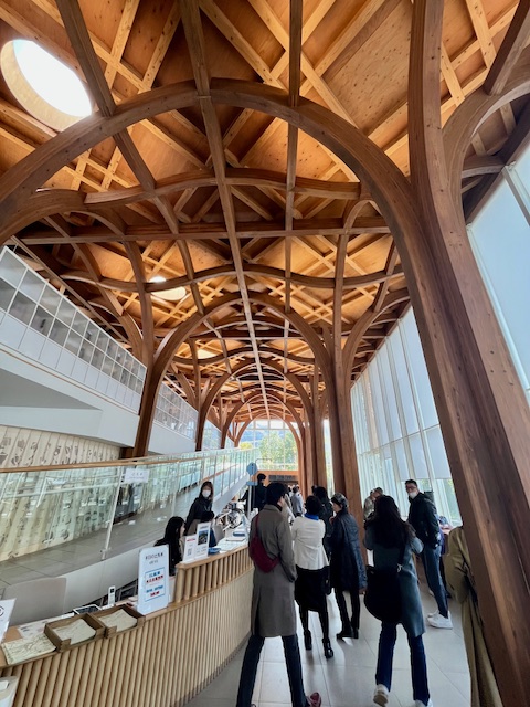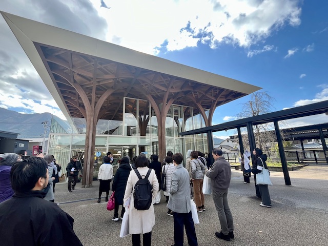 続いて、由布院駅の左手にある「由布市ツーリストインフォメーションセンター」へ。磯崎氏のアトリエ出身の建築家・坂茂(ばんしげる)氏の設計で、2018年に完成した。