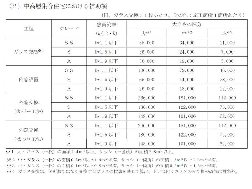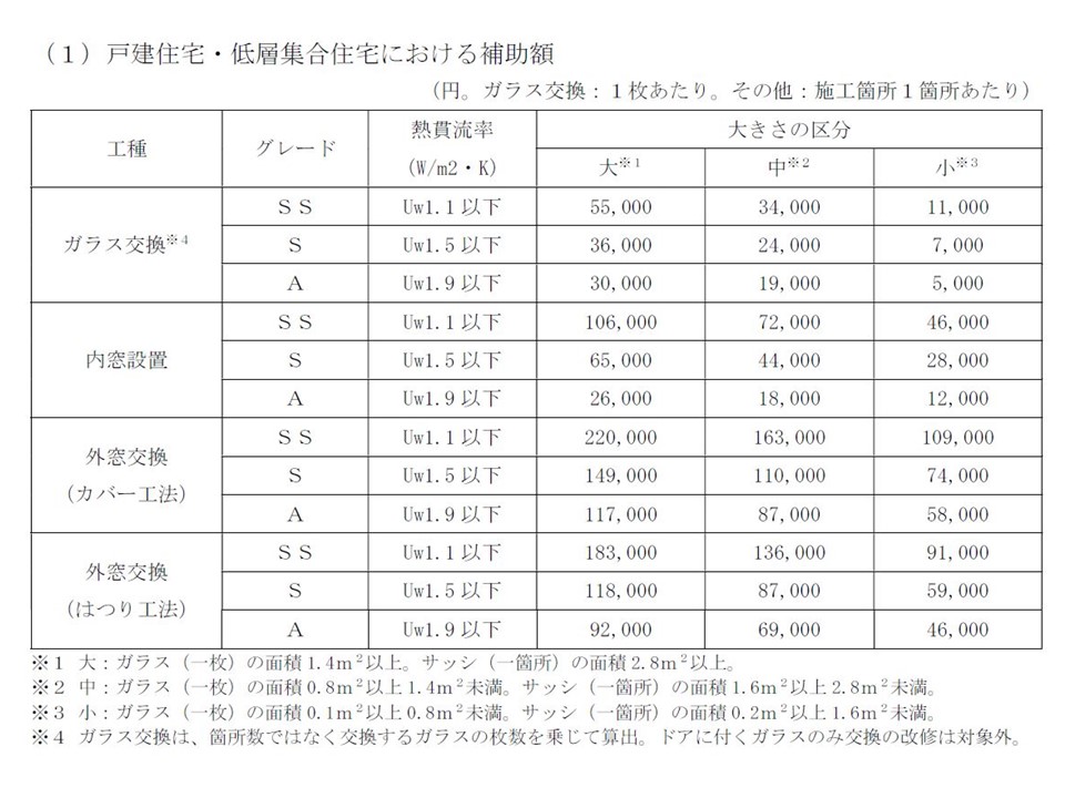 補助額は対象となるリフォーム工事の「補助単価×施工箇所数」の合計になる。補助単価は、住宅のタイプごとに窓の熱貫流率(U値)、大きさの区分、工事の方法によって下の図のように設定されている。窓の大きさ区分について2024年度は「大・中・小・極小」の4つだったが、2025年度は「極小」がなくなり3つになっている。なお、工事の方法については後述する。