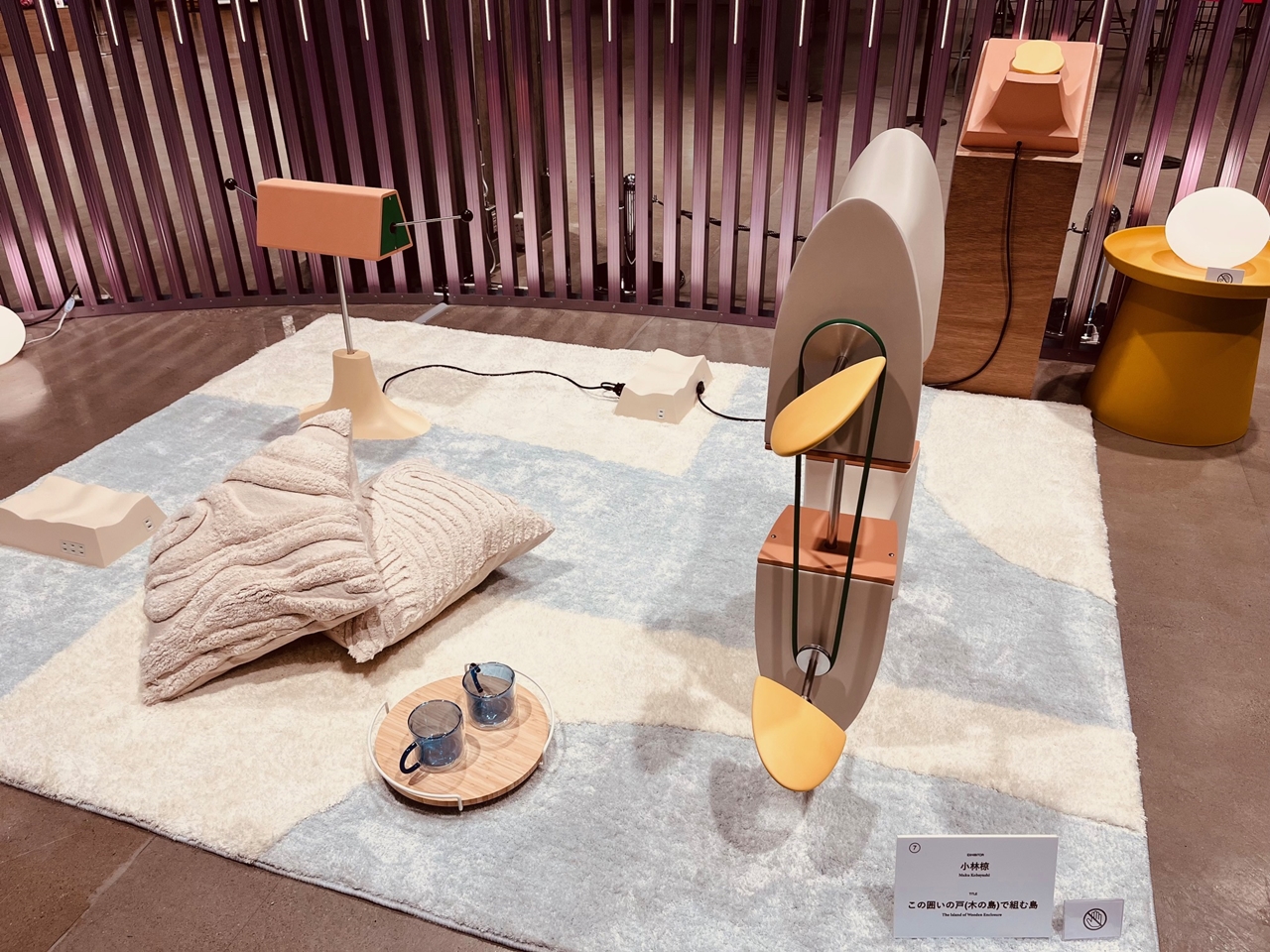 ピンクがかった紫とグリーンの柱がぐるりと囲む不思議な空間。柱の内側にはソファや家具のようなものが展示されているのが柱の外から見て取れる。一風変わったリビング空間を演出するここは、東京メトロ有楽町駅から徒歩すぐの場所にある「SusHi Tech Square」で開催中の「Alternative Living展」(2025年3月23日まで)だ。