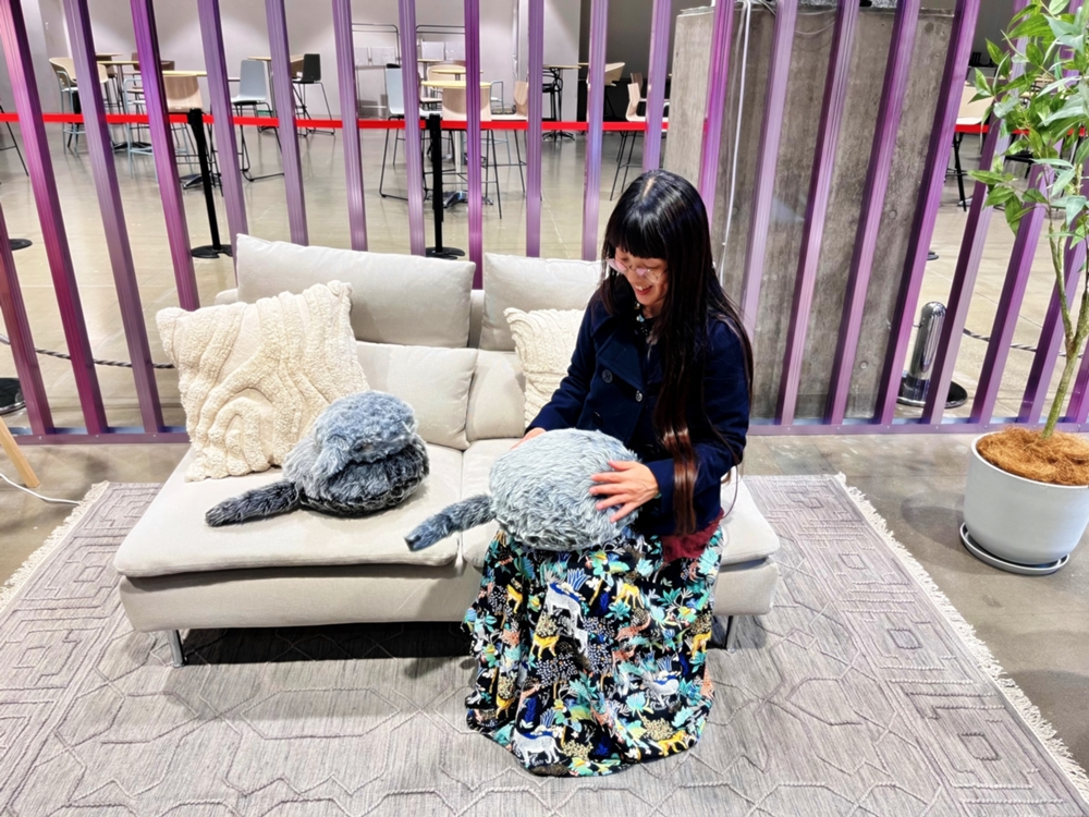 企業からの展示はユカイ工学株式会社の「しっぽがある暮らし」。クッションのような「Qoobo(クーボ)」は、なでるとしっぽで反応するロボット。内蔵されたセンサーによってなでられ方のパターンを解析し、独自のアルゴリズムでしっぽの反応が変わっていく仕組み。膝に抱いてなでていると、鼓動のようなリズムも感じられる。すでに商品化されているというから、ロボットと一緒に暮らす日常はもうすぐそこなのかもしれない。