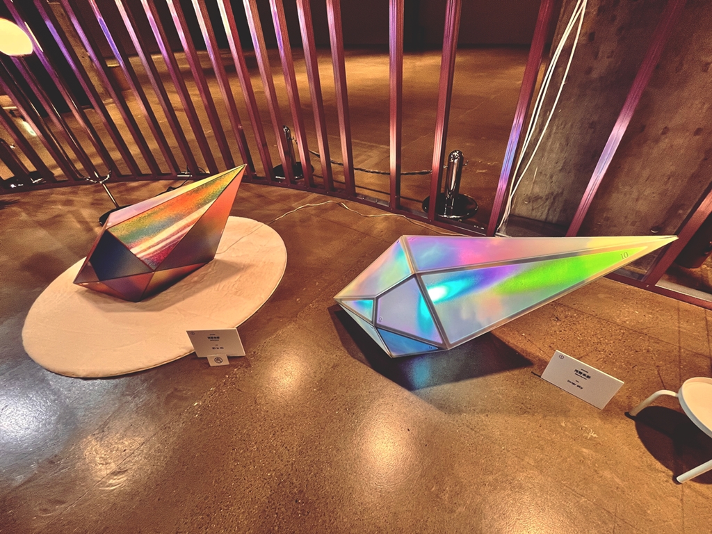 2つの尖った物体は、視覚ディレクターでありグラフィックアーティストの河野未彩氏が手がける「inner sky」と「3D to 4D」の連作。私たちも利用しているクラウド(ネットワークサーバー)から着想を得た作品となっている。