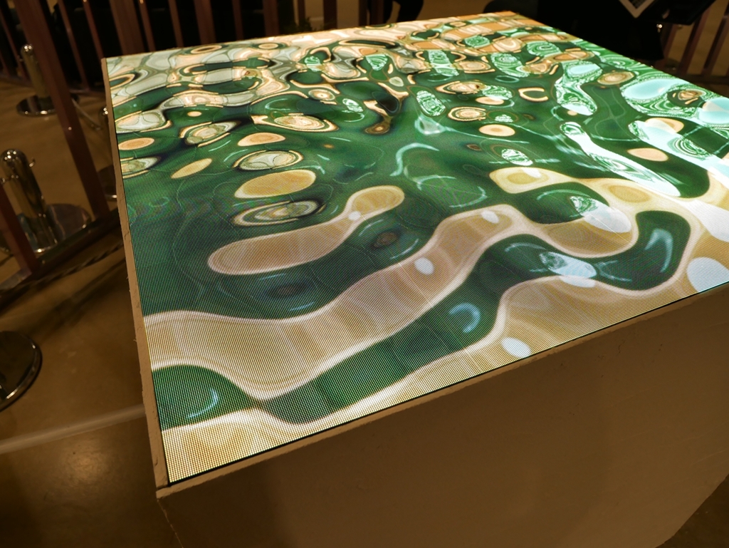 水鏡のような画面に映像が映し出される「ヌル鏡止水」は落合陽一氏の作品。筑波大学准教授、デジタルネイチャー研究室主宰などさまざまな肩書きを持ちながらメディアアーティストとして作家活動に取り組む落合氏。今回の作品は、「走馬灯という人生の残響を“デジタルの水鏡の下”に可視化する」というもの。浮かんでは消えていく映像の中に何を見るのか、人が自分の心を深くのぞき込む体験を、テクノロジーを介してどこまで手助けできるか、がコンセプトになっているという。