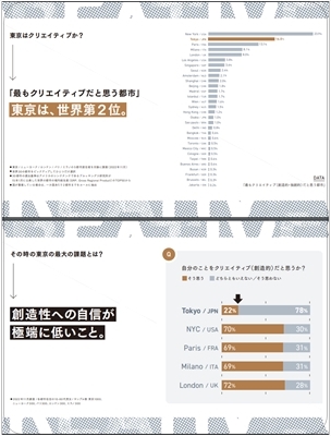亀山氏が取締役を務める株式会社SIGNINGの調査(※)によると、「最もクリエイティブだと思う都市」ランキングで東京はニューヨークに次ぐ世界2位に選ばれている。しかし、「自分のことをクリエイティブ(創造的)だと思うか?」という問いには、わずか22%の人しか「そう思う」と答えていない。ニューヨーク、パリ、ミラノ、ロンドンでは約70%の人が「自分は創造的だ」と答えており、日本人の創造性への自信が極端に低いことがわかる。