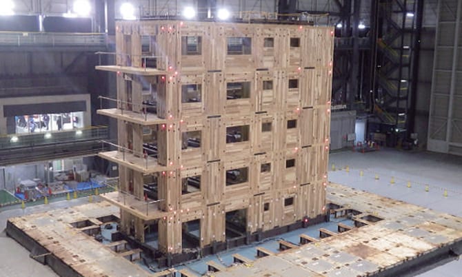 「CLTで作った木造5階建ての建物に振動を与える実験をしました。阪神淡路大震災の観測波よりも大きな力を加えても倒壊しないことが確認されています。建築物の耐震性を決定づけるのは部材の組み合わせや構造体の設計によるところが大きいといわれています。単に木造だから、鉄骨造、鉄筋コンクリート造だから、というだけでは測れないものなのです。また、地震の揺れは建物の重さが大きく関係しています。重いものほど揺れの力を受けるため、鉄骨造、鉄筋コンクリート造よりも軽い木造は、揺れに対してリスクが低いともいえます」(小玉さん)。