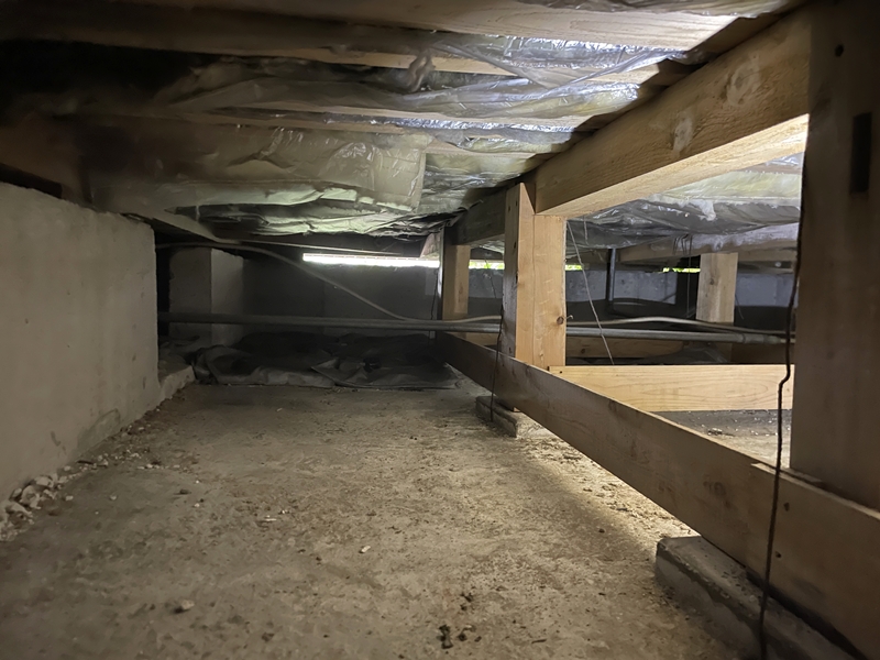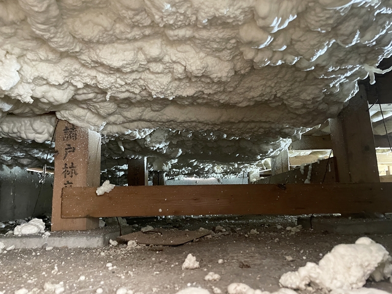 床は発泡ウレタンを吹付けて断熱した。既存の断熱はグラスウール(分厚いじゅうたんのようなものと考えると分かりやすい)を敷き詰めたものだったが、床下を覗いてみたところ、しっかり固定されておらず、部分的に垂れ下がっていた。そのため、ほぼ効果はなく、施工前は床下から冷気があがってきていたという。