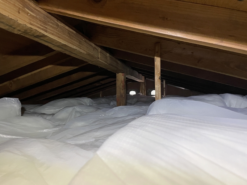 既存では断熱されていなかった1階天井には発泡ウレタンを吹付け、グラスウールが入っていた2階の天井には既存の上に二重にグラスウールを入れた。本来であれば古く湿気た既存のグラスウールは撤去しそうなものだが、僕の指示が悪く、施工会社が既存の上に新規を積んだため、現在の屋根裏は布団で一杯(!)にも見える状態に。