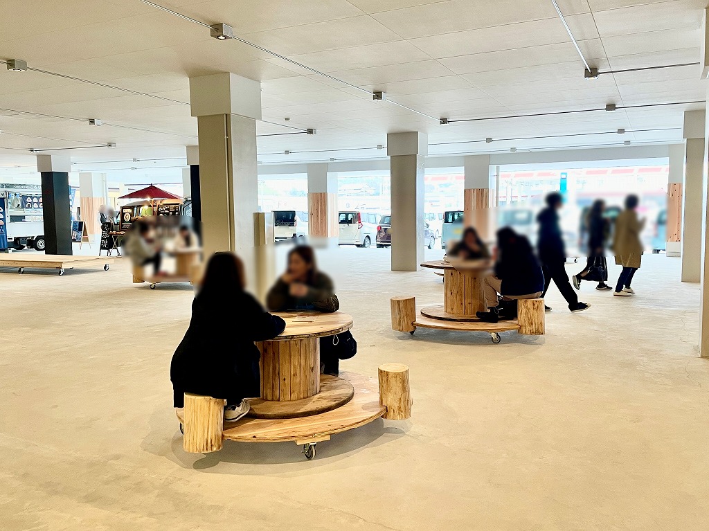 まず特徴的なのが、1階の広い全天候型の多目的スペースだ。旧レイの外壁を取り払い、廃材などを活用したテーブルやベンチを配置。スケボーパークやイベントスペースとしても活用するという。