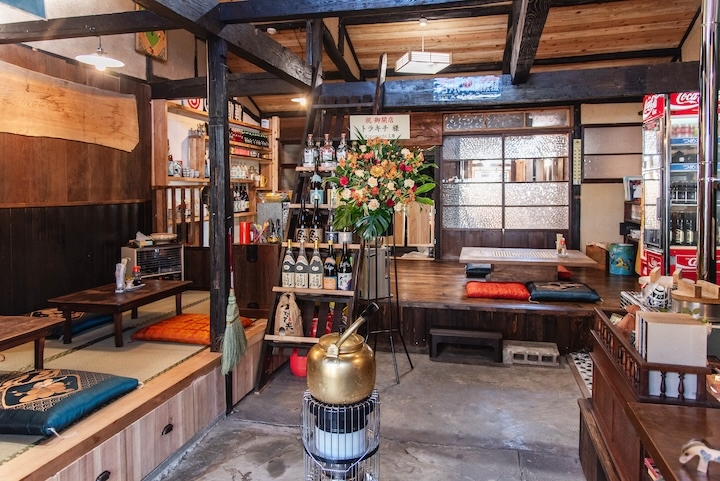 その楽しさ、違和感のなさの要因には店内のあちこちに既存の材、品を使った部分がある点が挙げられる。玄関の正面にある日本酒などが並べられている棚は以前は2階に上がるための階段だったそうで、現在は表に酒類、裏側にアルミの急須などを並べて使っている。