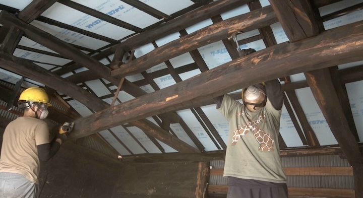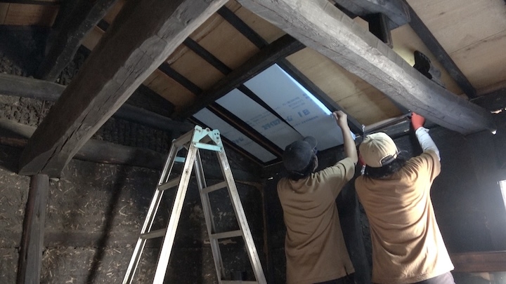 汚れた梁、柱を掃除した上、屋根には断熱材を入れ、その上から板を貼った。古い家は暑く、寒いものだが、そこで快適に暮らすためには断熱材は必須。天井、壁、床に入れれば酷暑、厳寒に辛い思いをしなくて済むようになる。隙間にもたっぷり詰めることが大事だそうだ。
