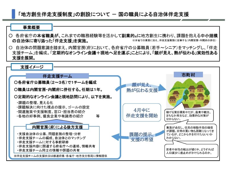 そうしたなか、政府では「地方創生伴走支援制度」を2025年4月に開始した。これは、国の職員が人口10万人未満の支援対象地方自治体に副業として伴走支援を行い、課題に対して取り組んでいくものである。
