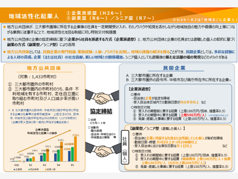 続いて、2014年から開始した総務省の制度「地域活性化起業人」を紹介する。地域活性化起業人は、三大都市圏、三大都市圏外の政令市・中核市・県庁所在市の人材が自治体と協定を結ぶことで、地域活性化の活動を行っていくものだ。