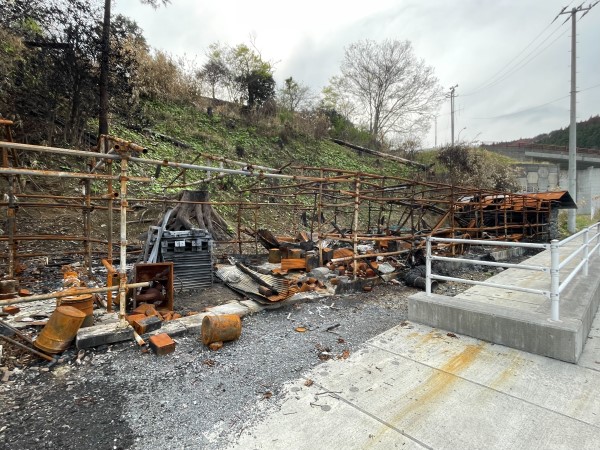 山火事から2ヶ月ほど経過した4月28日に大船渡駅から綾里駅までバスに乗って取材に向かったが、たしかに最初は山火事の被害はあまり見られず、変わらぬ町の風景が広がっていたものの、綾里地区に差し掛かったとたん、黒く焦げた山肌や倒壊した住居、建物が現れた。燃えてしまった建物に近づくと、まだ焼け焦げたにおいが漂っていた。