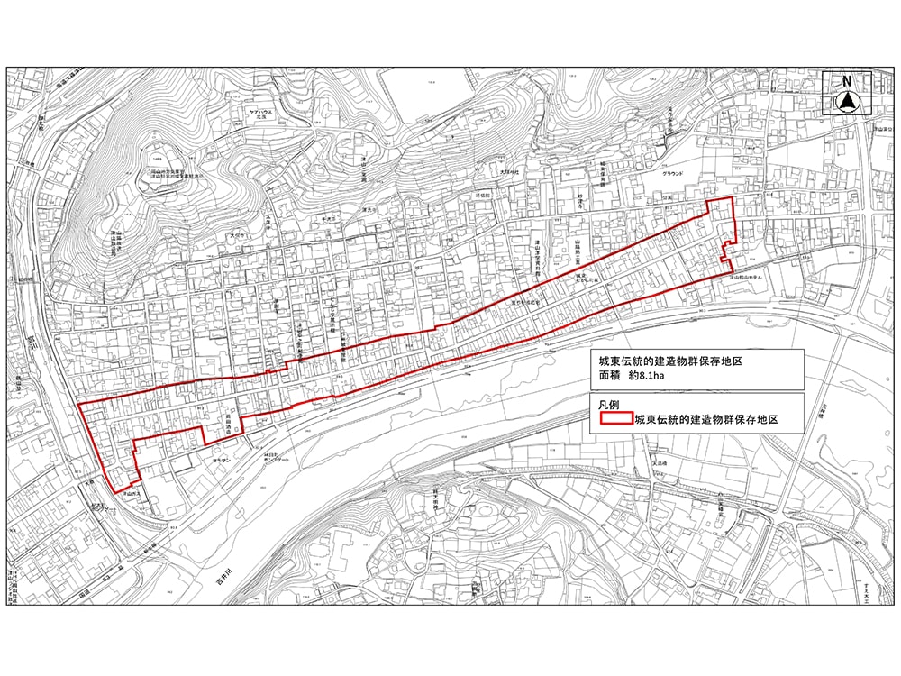 城東地区は津山城下の一部であり、城下町東部に位置する。重伝建に選定されているのは、吉井川と並行するように東西に延びる出雲街道沿いの約1.2kmにわたる約8.1haのエリア。町人地であり、江戸時代から明治・大正時代を経て昭和時代の戦前ごろまで商家町として栄えた。