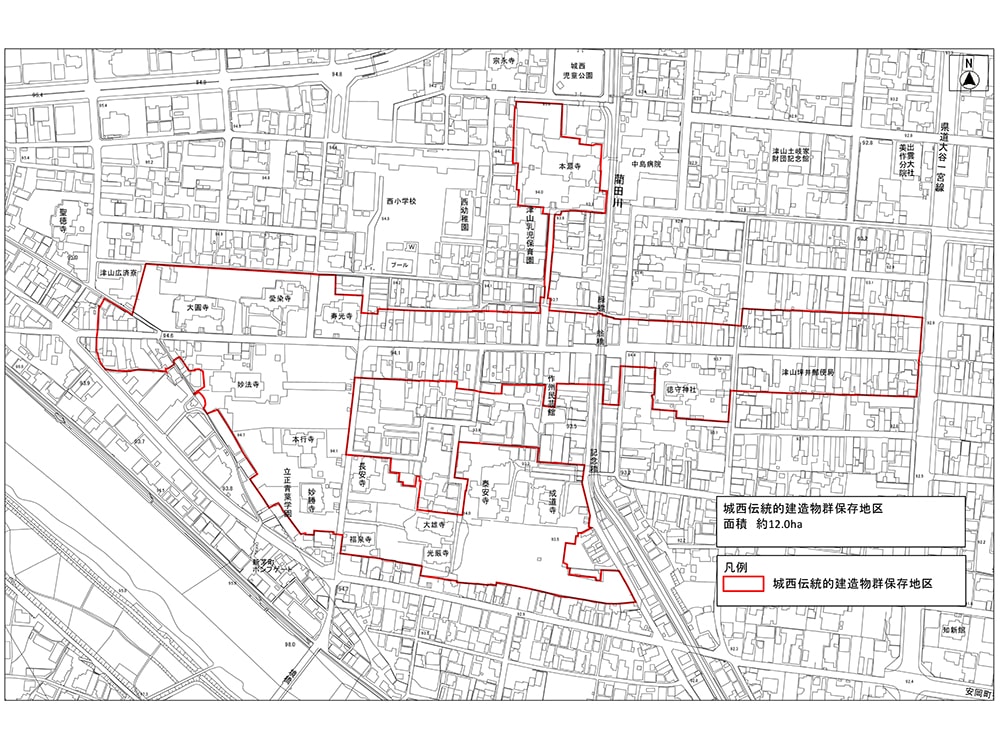 城西地区は津山城下の一部で、城下町の西部にあたる。出雲往来沿いの町人地で、江戸時代より商家町として栄えた。また地区内西部は寺町であり、歴史ある寺院が多く所在する。江戸時代の商家町としての町家と寺院、そして明治から昭和戦前期の近代建築が織りなす町並みが、城西地区の特徴だ。