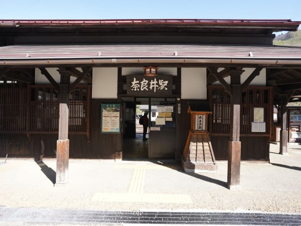 JR奈良井駅の伝統的な駅舎から出ると、江戸時代にタイムスリップしたかのような町並みが広がる。