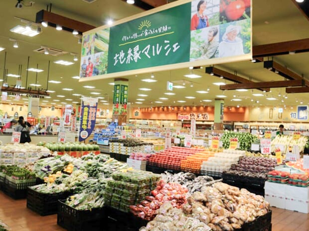 エブリイの地縁店としての取組みで、代表的なものが「地縁マルシェ」である。地縁マルシェとは地域で農産品や水産品・加工品・総菜などの生産者が、店に直接納品して「地縁マルシェ」コーナーで販売するもの。道の駅などで見られる産直コーナーに近いイメージだ。