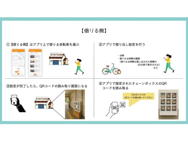 ①自転車を駅の駐輪場に置き、アプリで自分の身長や貸し出す時間などの貸出設定を行う。