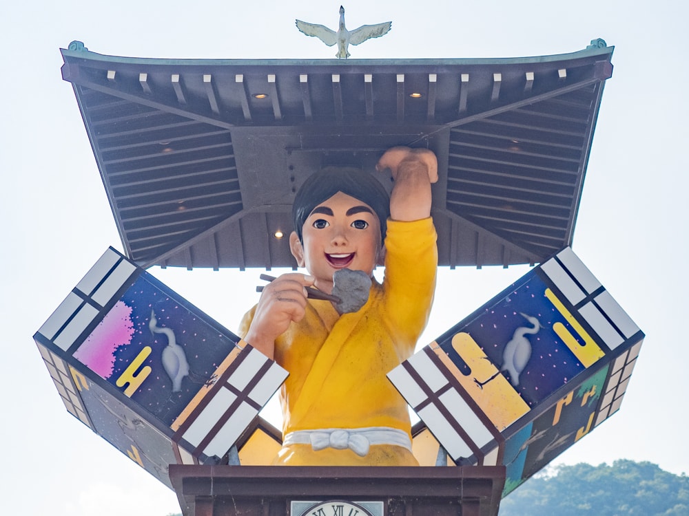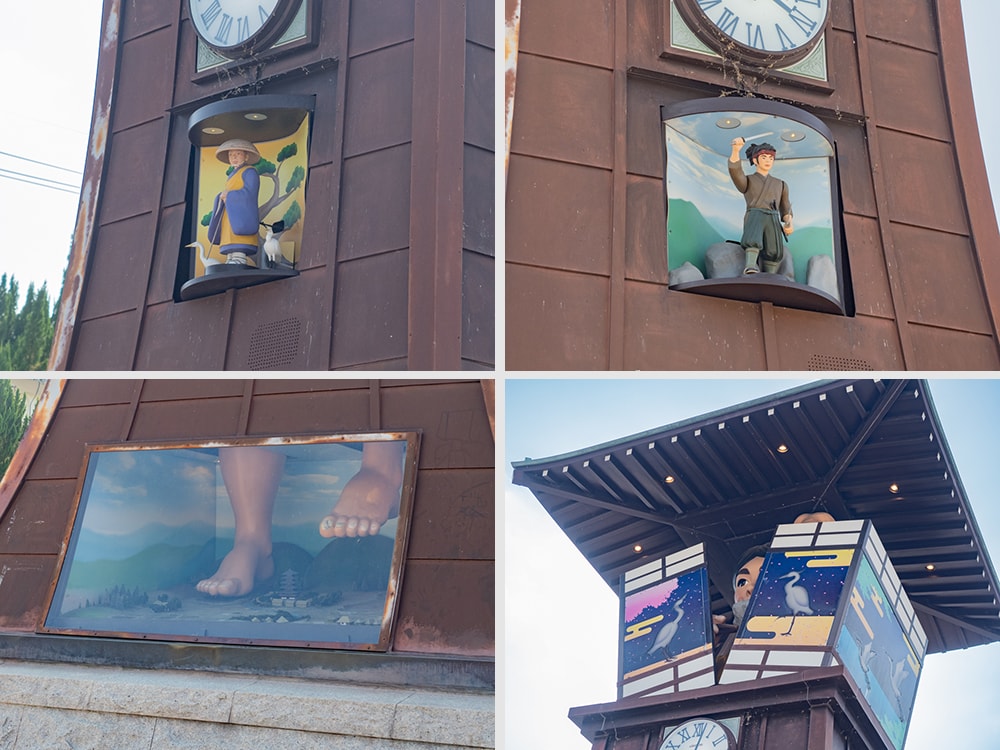 湯郷温泉街の東部、湯郷こども園の南側にある。高さ7.9m、幅4.3mの巨大時計で、毎日8時〜21時の間、毎時0分ごとにからくり寸劇が上演される(約4分間)。寸劇は湯郷温泉を発見したとされる円仁法師や、美作市ゆかりの剣豪・宮本武蔵に関するもの。また美作に伝わる巨人「さんぶ太郎」も登場し、時計上部が開いてさんぶ太郎が出現するという演出が見どころだ。