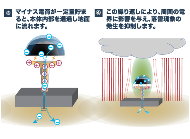 「雷というのは、積乱雲の雲底のマイナス電荷と地上から上昇するプラス電荷が引っ張り合い、結びついた時に巨大な電流が流れることで発生します。『dinnteco』は、アースと接続することで、地上からプラス電荷を、製品周囲からマイナス電荷を集めて本体内で中和する働きをします。これを繰り返すことで地上からのプラス電荷の上昇を抑え、雲のマイナス電荷との結びつき、落雷現象を防ぐというメカニズムです」